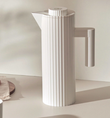 Le drapé de la famille Plissé habille un nouvel objet pour la table. Nouvelle venue dans cette collection phare, la carafe isotherme imaginée par Michele de Lucchi reprend les lignes géométriques concises et la composition soignée des autres éléments de la série pour créer un objet qui offre une synthèse entre contraintes techniques, hautes performances et élégance couturière