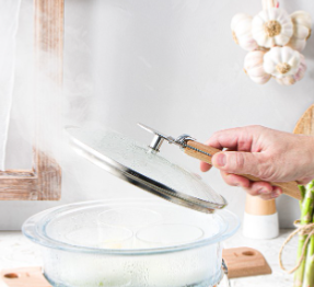 Couvercle en verre cerclé inox.