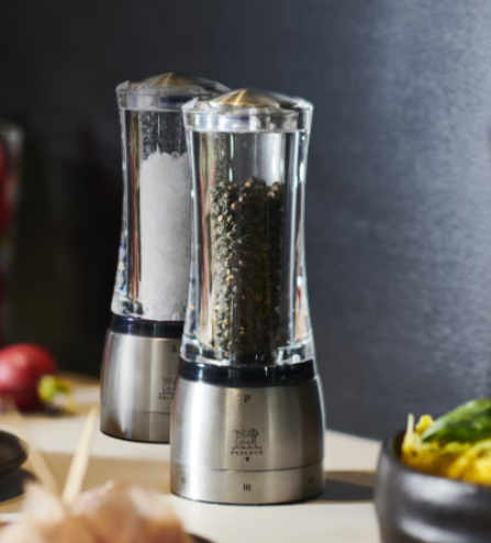 Tout en transparence, le moulin à sel Peugeot de la collection Daman s'est allégé de son axe central pour laisser pleinement apparaitre les cristaux de sels qui le compose. Son design épuré associe de manière élégante la transparence de l’acryl à l’éclat unique de l’inox. Il est doté d'un système breveté de réglage de mouture appelé u’Select qui permet de varier les saveurs en sélectionnant une taille mouture de sel parmi les 6 sélections possibles. Equipé du mécanisme Zirlion, fruit de la Recherche et Dévreloppement Peugeot et garanti à vie, ce moulin offre une variété de mouture allant du Sel Glace d'une extrême finesse jusqu'au sel croquant pour goûter à tous les plaisirs du sel tout en offrant la possibilité d'en limiter la quantité utilisée.