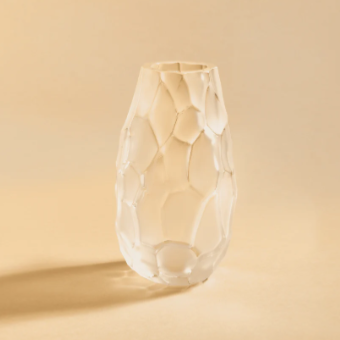 À travers ses vases et coupes, Lalique transpose l’élégance brute du silex en créations raffinées. Le cristal satiné repoli, travaillé sous diverses finitions, joue avec les contrastes, les reflets et la lumière.