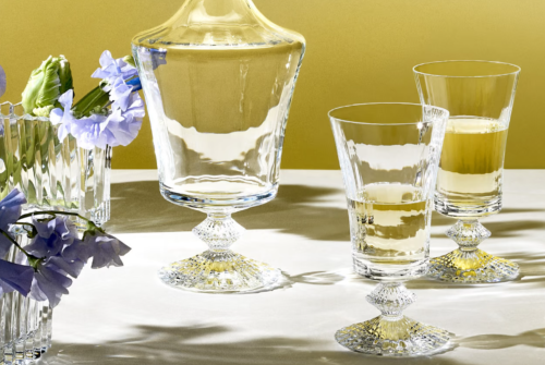 Le verre cristal clair Mille Nuits est rythmé de subtiles côtes vénitiennes sur toute sa paraison et évoque par son élégance le charme et l’opulence des palais orientaux. Rayonnant depuis la jambe, le motif de côte vénitienne se poursuit sur le pied du verre. Élément décoratif emblématique de la collection de verres Mille Nuits, l’élégant bouton losangé au centre de la jambe fait le lien entre la base de la paraison et le pied.La collection Mille Nuits se décline aussi en Arts de la table (carafes et assiettes) et Décoration (chandeliers, lampes et candélabres).