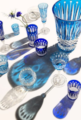 Le Roemer bleu clair fait partie d'un service de table en cristal de couleur. Celui-ci se compose également d'une flûte à champagne, une chope, un gobelet cylindrique petit, un verre à cocktail et un old fashion moyen n°3.